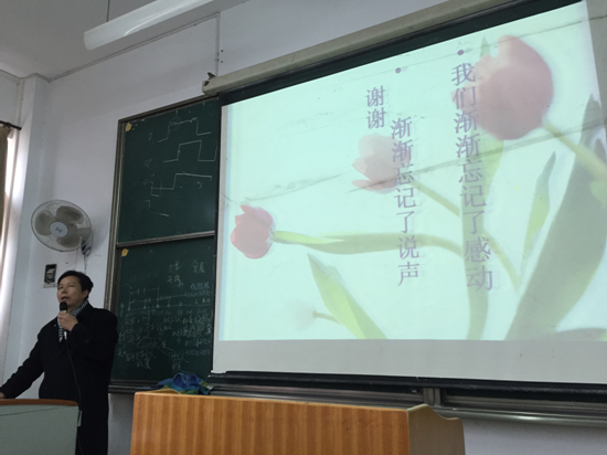首先,江俊新老师强调感恩就是乐于把得到好处的感激呈现出来且回馈给他人,得到资助的同学首先应该学会感恩父母。从我们呱呱坠地时,父母对我们倾注了无数的爱,无论有多大的成就都不能忘记父母“汪洋”般的恩亲。于此同时我们还应感恩国家、感恩社会、感恩学校。感恩国家的大好政策对寒门子弟求学的大力支持和关爱,国家奖助学金不但能帮助我们减轻家庭负担,期望我们更好地生活和学习,增强信心,也使我们多了一股责任感。感恩社会给予我们的一切,感恩学校培养教育我们成人成才,感恩德高为师、身正为范的老师无私奉献的付出。其次胡老师给我们讲到,古人言勿以善小而不为,感恩就是从身边小事做起,勤奋努力,积极参加集体活动,加入积极有益的团体,不断增强个人修养与技能素质,以知识和实践充实自己的老员工活,来回报父母、回报国家、回报社会。告诫我们身处何时何地为人、为官、为人子女、做学者等千万不能没有感恩之心,不能唯利是图;并从微软副总和一位小职员的事例告诉我们报恩之心比什么都高尚,心怀感恩之心必定会有所回报,有着感恩的心是走向成功的基础 。接着,员工代表电科专业2013级李显春和耿凤霞的发言道出了同学们心声,积极参加活动,努力学习,学会感恩,不辜负学校和老师的期望学习好专业知识,争做新时代的弄潮儿。