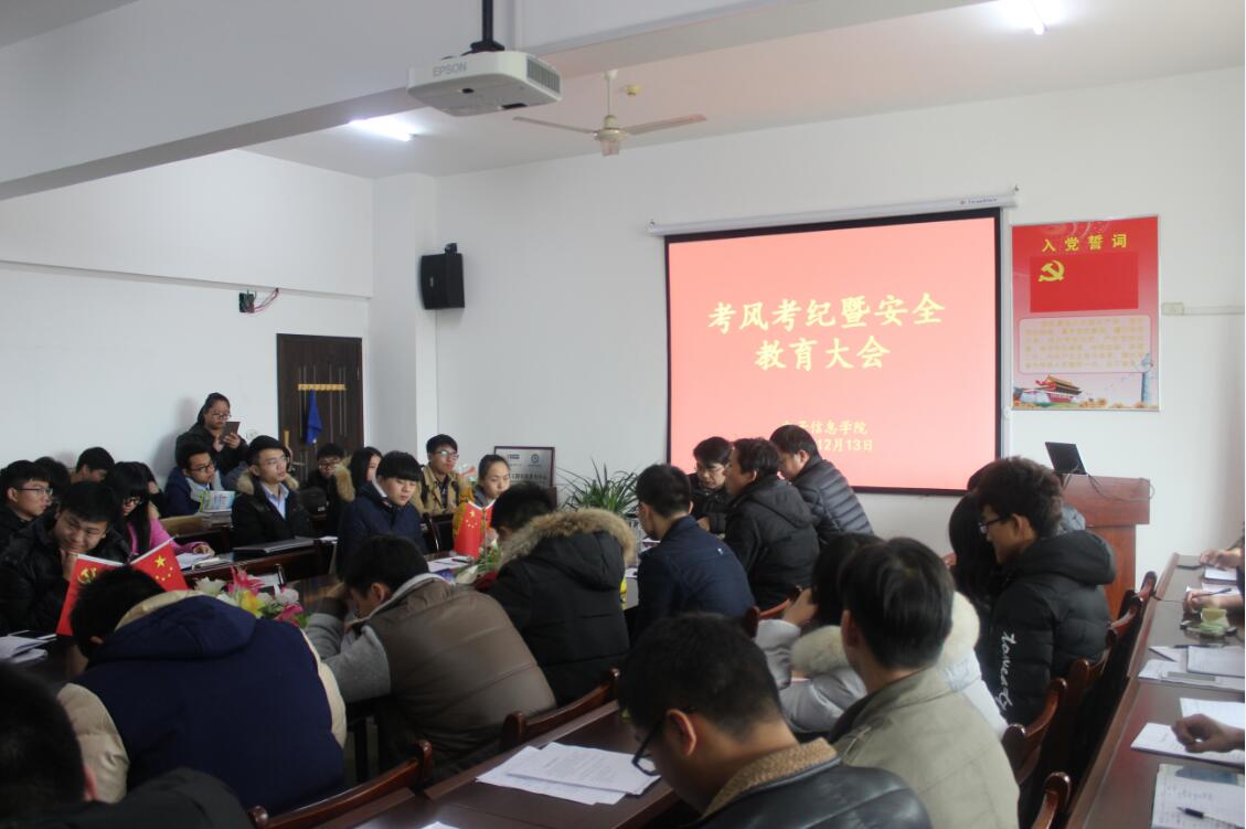 2016年12月13日中午,公司考风考纪暨安全教育大会在北区科技楼405会议室顺利召开。电子信息公司党总支副书记闵艳林,学工办主任江俊新,辅导员王巍,严丹以及全院各班班长、团支书参与此次会议。