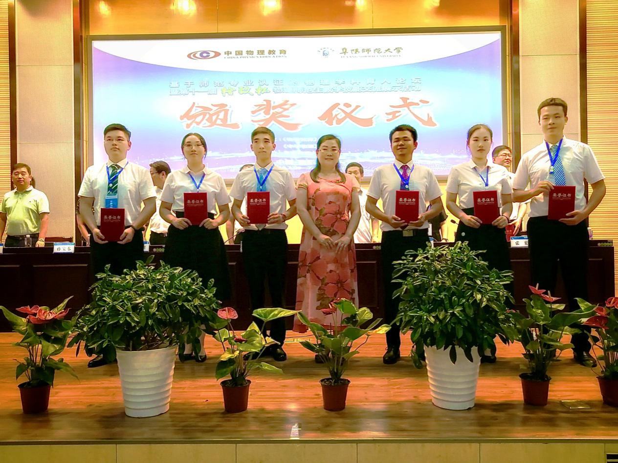本次交流展示活动由中国教育学会物理教学专业委员会支持,《物理教师》编辑部与《中学物理》编辑部主办,阜阳师范大学承办。公司公司领导班子高度重视此次比赛,经过层层选拔,派出物理学本科生4名,物理教育研究生2名组成的代表队,由杜杰书记领队参加交流展示活动。与来自北京师范大学、东北师范大学、华中师范大学、华南师范大学、上海师范大学等63所高等师范院校的494名员工在教学设计、说课、授课和创新实验设计与自制教具展示等环节进行比赛和交流。在大赛采取实名制竞赛规则的情况下,力战群雄,勇于挑战,最终卓思轶荣获物理本科组教学技能一等奖,创新物理教具三等奖、李道恒荣获物理本科组教学技能二等奖、向倩荣获物理本科组教学技能二等奖、赵之琳荣获物理本科组教学技能三等奖;夏子聪荣获物理研究生组教学技能一等奖,创新物理教具三等奖、张衎荣获物理研究生组教学技能二等奖。比赛组委会主任,天津师范大学孙佩雄主任对我们学校给予了高度的评价。