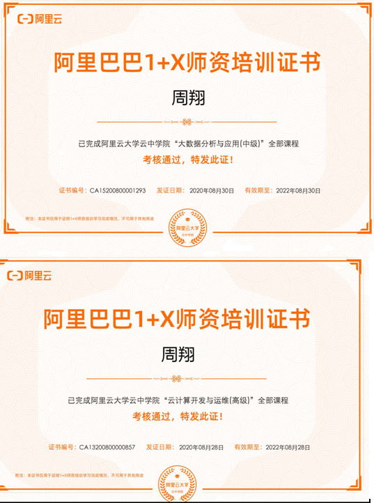 bevitor伟德国际1946在暑假期间组织相关老师(兰智高,熊杰,祁翔,谢伟,刘珊,周翔)参与了阿里巴巴1+X职业技能等级证书团队线上培训。大数据分析与应用(7月22日-24日),云计算开发与运维(7月28日-30日),并于8月20日前完成云中对应层级的资料学习并参加该层级内容测试,通过后获得团队培训证书。