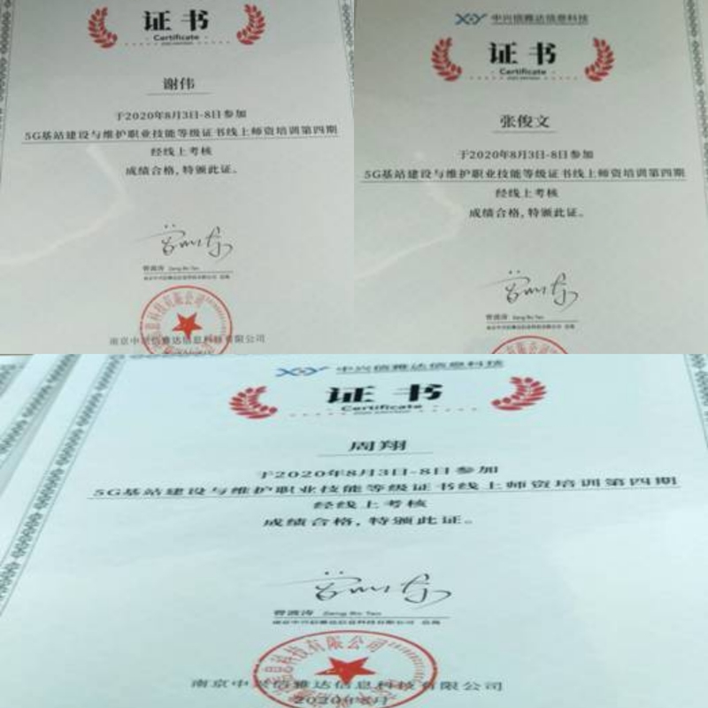 bevitor伟德国际1946在暑假期间组织相关老师(谢伟,张俊文,周翔)参与了5G基站建设与维护职业技能等级证书团队线上培训(8月3日-8日)并参加测试,获得团队培训证书。张俊文老师于8月24日-31日到重庆电子工程职业学院国培基地参加了1+X 5G基站建设与维护线下培训并结业。