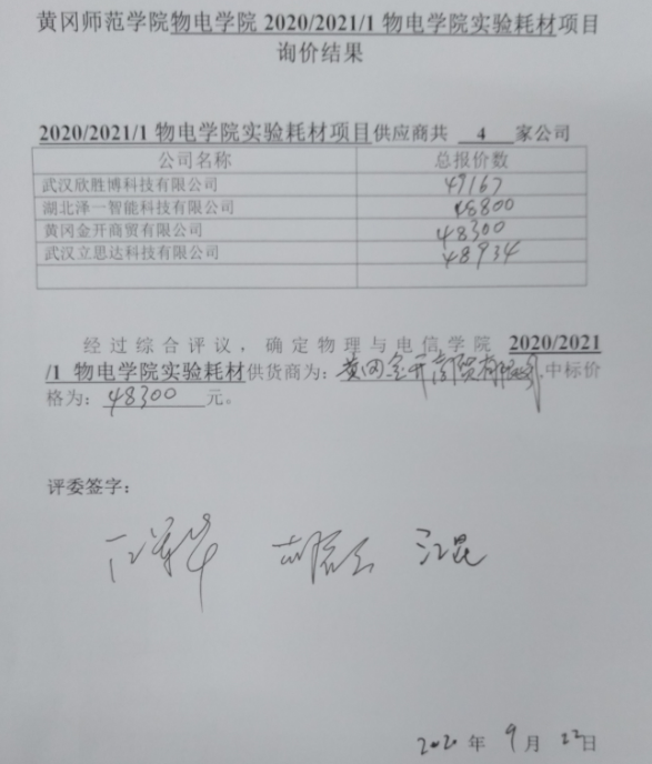 bevitor伟德国际1946物电学院2020年秋季第一次实验耗材的采购招标工作从2020年9月13日启动,公开面向社会招标,并在学院网上公示,截止到9月20日共收到有效标书4份,于9月20日学院组织人员开标,开标结果为:黄冈金开商贸有限公司以人民币48300元的价格中标。在此表示祝贺。