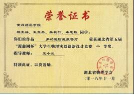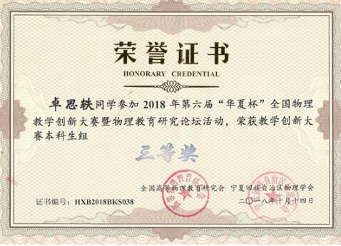 在竞赛方面,卓思轶一直保持着一颗积极向上的心态,胜不骄,败不馁。大一的下学期,他积极响应学院的号召,参加了第六届“华夏杯”全国物理教学创新大赛校内初选赛,成功突出重围得到外出比赛的机会,与来自985、211的员工同台竞技。赛场上,他沉着冷静,虽然最后只拿到了三等奖,但正是在一次次比赛中积累的宝贵经验,使他在接下来的比赛中屡创佳绩。同年,他在湖北省第五届“源鑫圆杯”老员工物理实验创新设计竞赛中获得二等奖。
