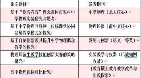 围绕着创新项目,卓思轶展开了细致的调研。最后在指导老师王小兰的帮助下完成了论文的撰写。论文题目为《基于自制创新教具提升中学物理概念教学的探究》发表在了《发明与创新》期刊上。此前还与向倩合作撰写了论文《基于“创客教育”理念黄冈市农村中学物理实验研究与思考》发表在《中学物理》期刊上。之后与李道恒合作在公司王立兵、陈向军主编的图书《教育硕士公司产品改革与实践探索》上发表论文《高中物理课标对比研究》;与王锦涛合作在教育类期刊《实验教学与仪器》上发表论文《物理师范生教学技能创新大赛的策略研究》;与沙乾合作在前中文核心期刊《物理通报》上发表论文《基于中学物理互联网与传统课堂协同发展教学模式的探究》。