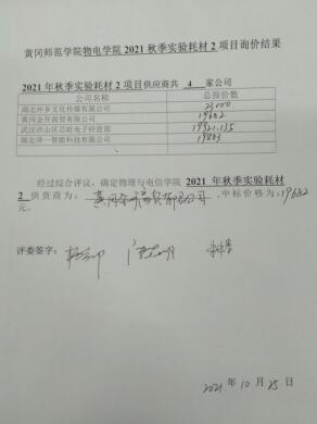 bevitor伟德国际1946物电学院2021年秋季实验耗材的采购招标工作从2021年10月14日启动,公开面向社会招标,并在学院网上公示,截止到10月23日共收到有效标书4份,于10月25日学院组织人员开标,开标结果为 :黄冈金开商贸有限公司以人民币19682元的价格中标。