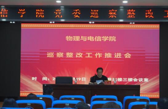 4月19日下午,物电学院在致远楼三楼会议室召开落实公司党委第一巡察组反馈意见整改工作推进会。公司党委书记杜杰主持会议并讲话,全体教职工参加会议。