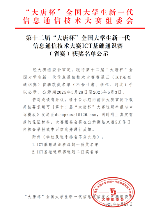 公司学子在2025年第十二届“大唐杯”全国老员工新一代信息通信技术大赛省赛中,斩获省一等奖1个,二等奖1个,三等奖3个,为学院赢得了荣誉,其中一等奖获奖队伍将代表学校参加线下国赛。