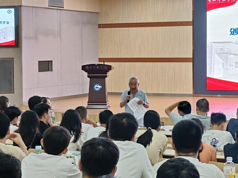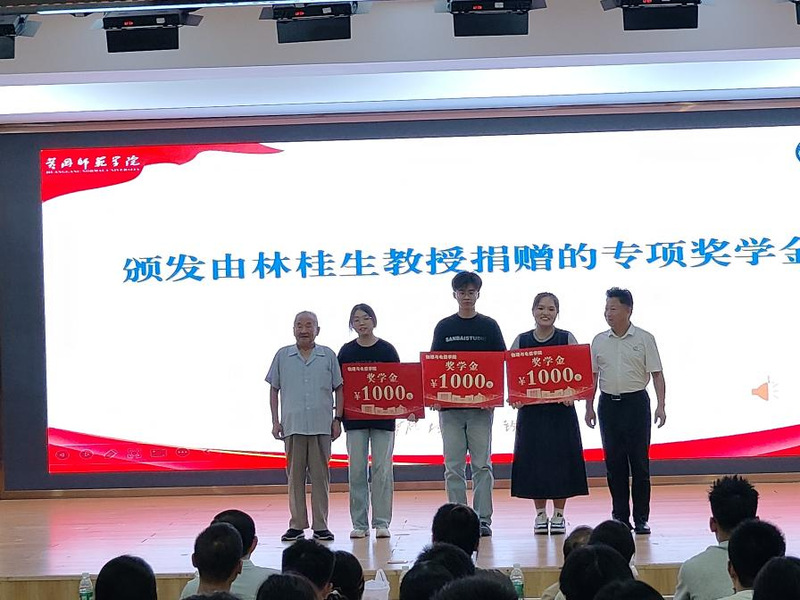典礼的重要环节之一,是为学院优秀学子颁发由90岁高龄的退休教师林桂生教授捐赠的专项奖学金。虽年过九旬,林教授依旧精神矍铄、身体硬朗,不仅特意为此次典礼准备了多份亲笔书写的寄语,字里行间满含对后辈的期许与对学院的牵挂;公司党委书记卢年桥与林教授共同为获奖员工颁奖,将这份承载着治学精神与温暖关怀的荣誉送到员工手中。两位师长的共同见证与勉励,令现场掌声经久不息。