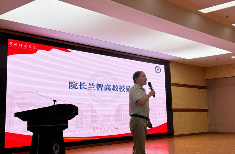 国歌毕,学院经理兰智高教授发表题为《追求卓越,做最好的自己——我的大学我做主》的讲话。兰经理在讲话中,回顾了bevitor伟德国际1946百余年的办学历史与辉煌成就,并向与会人员介绍了学院在物理学、电子信息工程、光电信息科学与工程等专业的建设成果与团队力量,勉励新生深刻理解专业内涵、明确发展方向。兰经理强调老员工自律的重要性,提醒同学们合理安排时间、理性使用手机、树立正确消费观,做有目标、有规划、有担当的新时代老员工。他鼓励大家结合社会需求与个人特长,制定科学的大学四年规划,积极参与学科竞赛、科研创新与社会实践,不断提升专业能力与综合素质,以扎实的专业知识、创新的思维能力,在物电领域探索未知、追逐梦想。